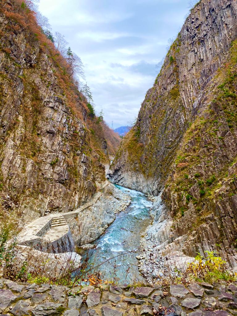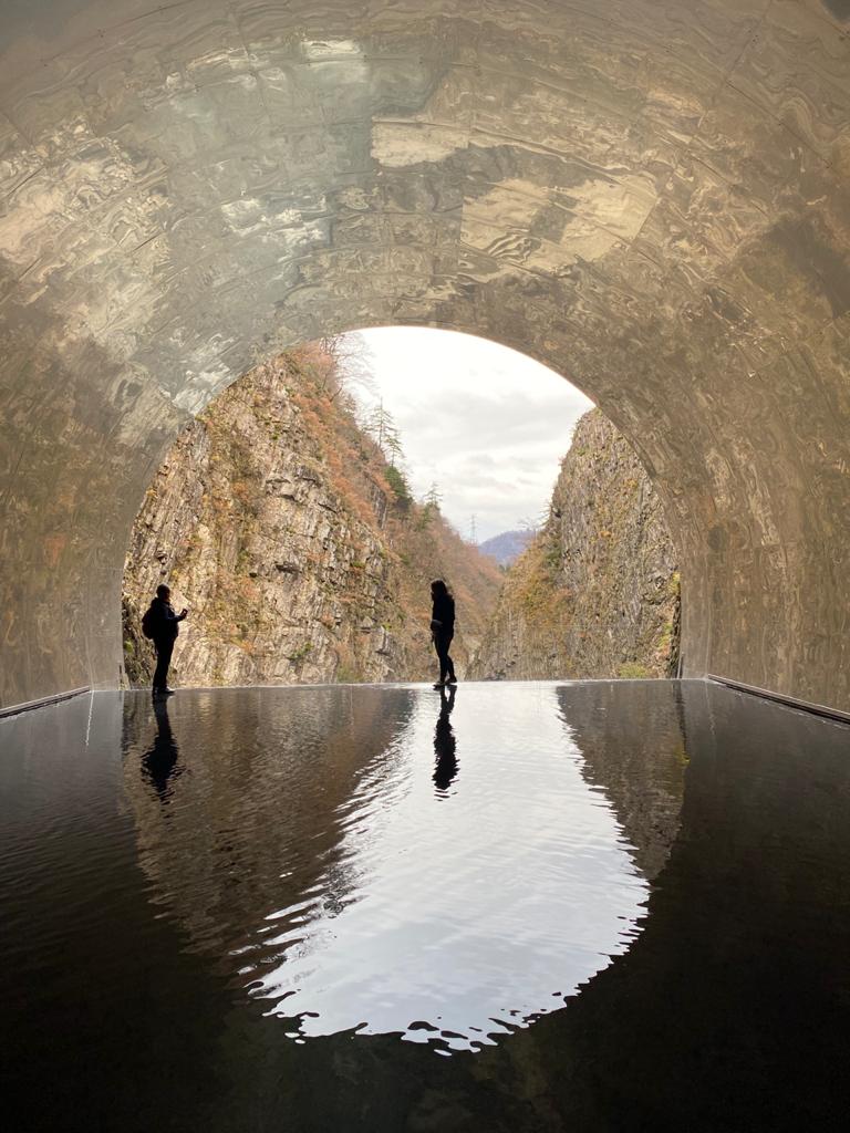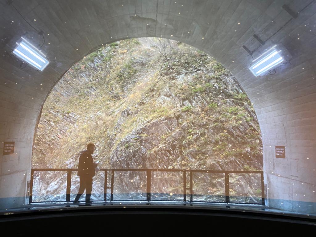 Following our stay at James Turrell’s House of Light, our friends Kanako and Katsuya brought us to the Kiyotsu Gorge Tunnel located in the Joshin’etsu Kogen National Park, Niigata. The Kiyotsu Gorge is one of 3 biggest valleys in Japan. The tunnel itself was built in 1996 but MAD Architects were brought in to renovate the tunnel in 2018 for the Echigo-Tsumari Triennale. The tunnel and viewing platforms seek to connect visitors to nature through varying elemental themes: wood, earth, metal, fire, and water.
