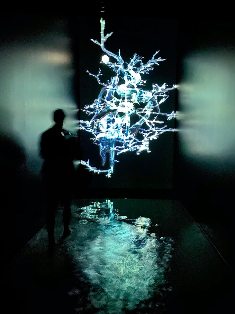 you come upon is filled with water. You step into the warm, almost milky, liquid with projections of swimming koi and blossoming flowers moving in around and colliding with you. The images are not pre-recorded but are interacting with you in real time. It speaks to the uniqueness of our individual experiences traversing this space and how we are in control of certain trajectories. Stepping into a smaller room, the feeling changes like spring into winter. The room is small and dark, the water cold, and a single quiet projection is in front of you. To me they looked like nerve-endings, neurons or even tree branches stripped bare. It felt essential and spiritual. Is this life or death? It seemed meaningful that two very different artworks would be placed directly next to each other with water (which bears life and takes it away) being the bridge.