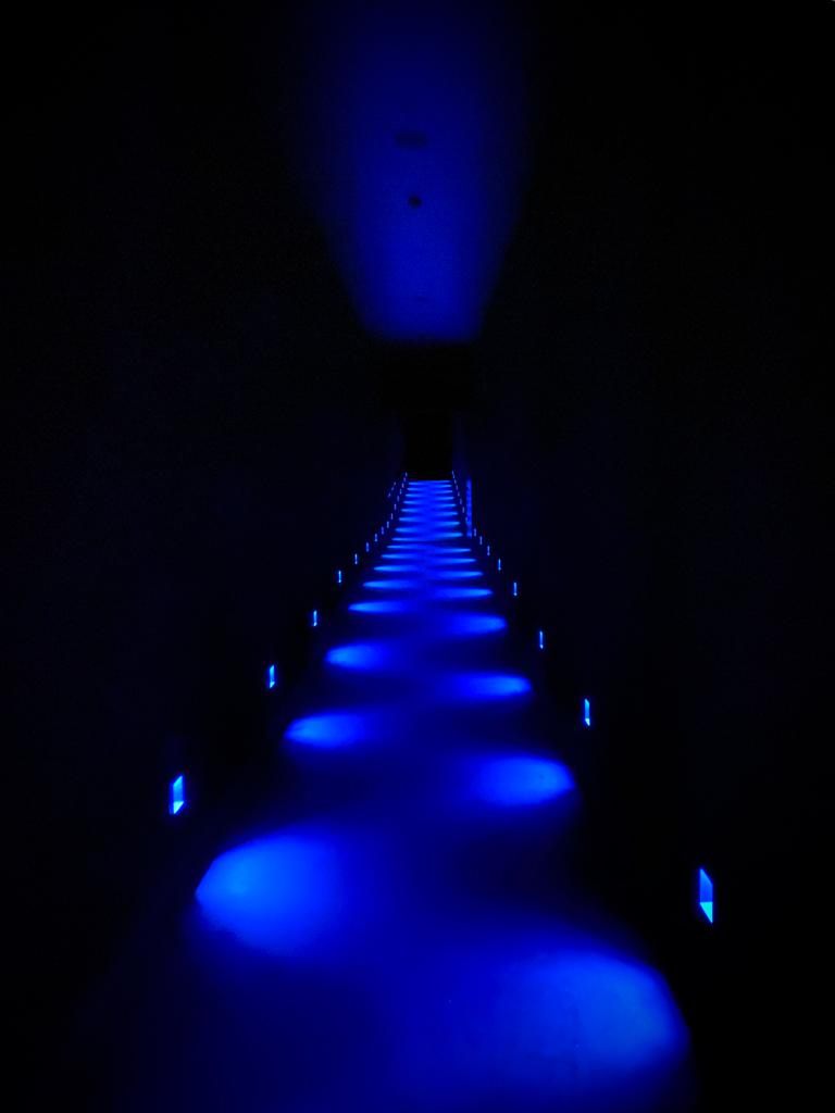 We started our tour in a large locker/changing room to prepare for walking through spaces with water and other sensorial set-ups. Corridors with various ambient lighting, textured flooring, changes in elevation, and even water segued into each of the main exhibition rooms. It definitely was made to heighten your senses in anticipation of what was to come. Certain segments reminded me of things experienced ex: at the entryway of one room, was a waterfall, and the lighting put upon it had the effect of individual glittering crystals falling onto the floor. It reminded me of watching water drip down from a wall with the sun hitting each droplet to activate the water, reflecting the light. I found it all very poetic and it was nice to have these in-between moments from the larger exhibition spaces to consider the experience wholly.